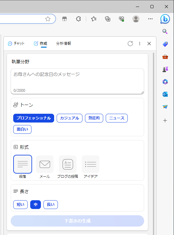 ブラウザのEdgeにbingアイコンが追加され、これでAIとチャットしたり、文章を書いて貰うことができるようになりました。